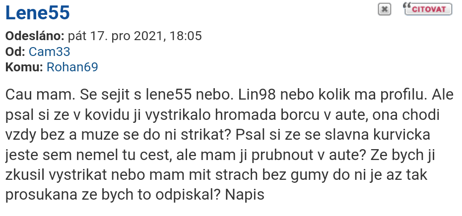 Zdravím tě Bilmc zajímavé že když napíšeš ty, tak je to pořád to samé. Někoho napadneš. Holka z Bohunic lin98 nově Lins99l6909 nebo lene55.