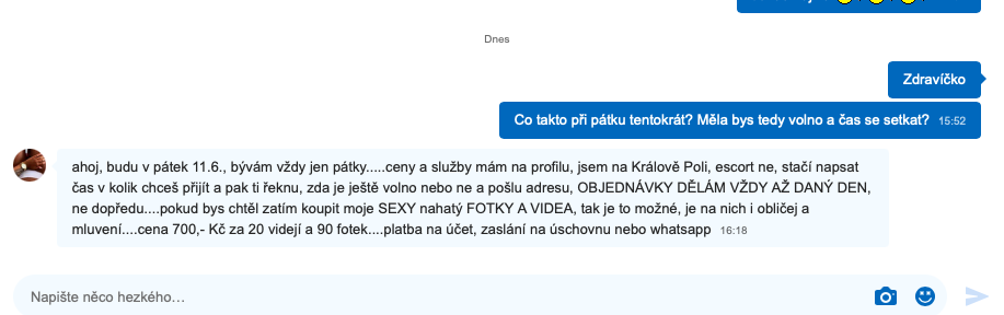 Vždycky mi odepsala, že pracuje jen v pátek, ať ji napíšu v ten den. Napsal jsem dva pátky po sobě a na to nereagovala. Potom mi pořád posílala jednu zprávu stále dokola. Jinak cenu píše nesmyslnou a podle mě je to taky fake.